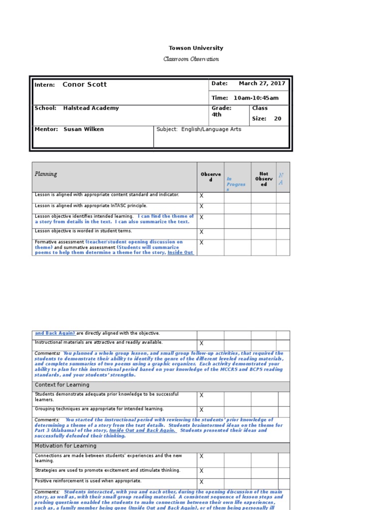 Conor Scott Teacher Observation Form Educational Assessment Teaching